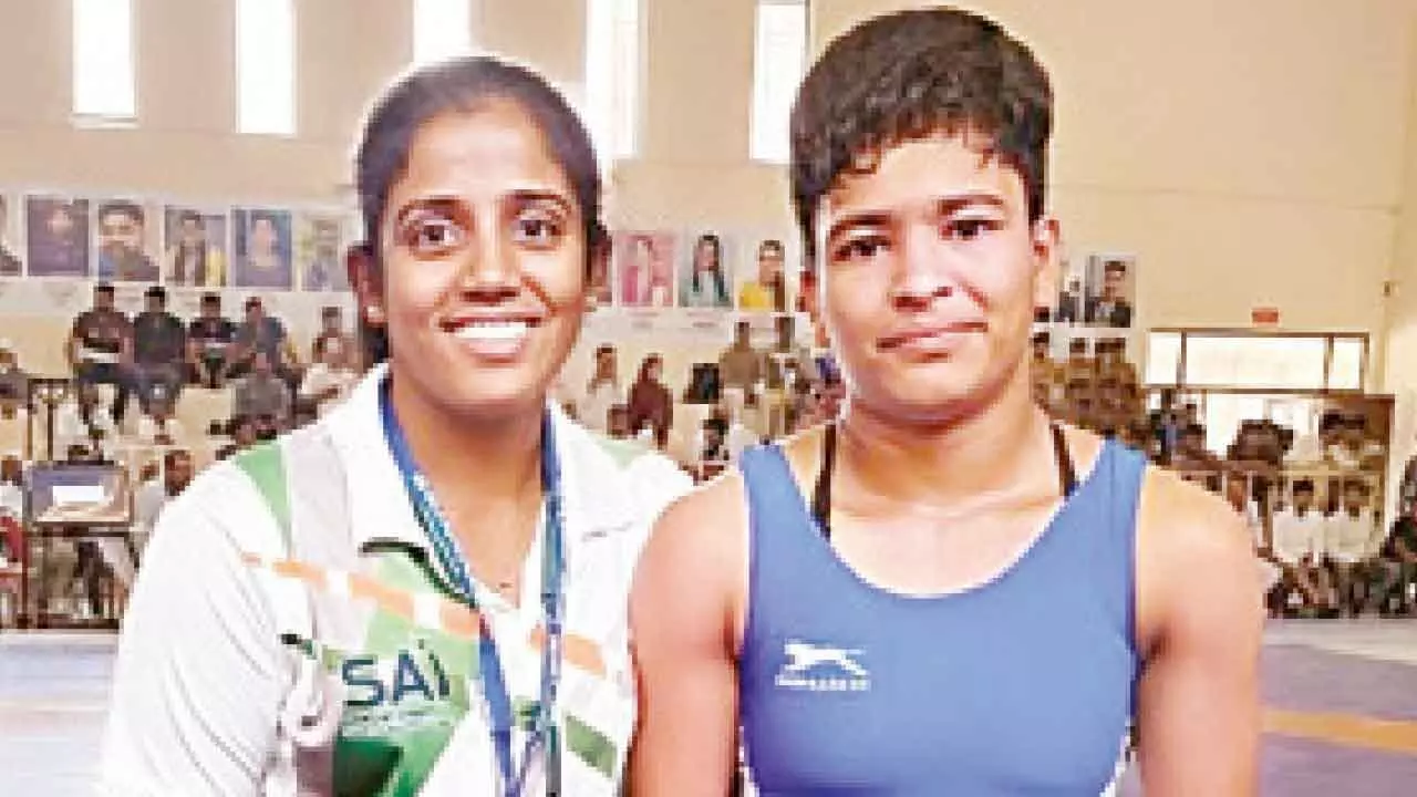 Telangana’s Geetha Pahelwan proudly displays her Bronze Medal after securing third place in the Girls’ 53 kg freestyle category at the 69th SGF Telangana State Wrestling U-19 Boys & Girls