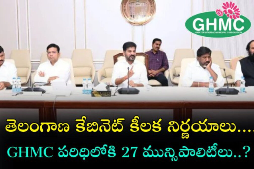 జీహెచ్ఎంసీని (GHMC) విస్తరించేందుకు తెలంగాణ కేబినెట్ ఆమోదం తెలిపింది. 27 మున్సిపాలిటీలను జీహెచ్ఎంసీలో విలీనం చేయాలని నిర్ణయించింది. ముఖ్యమంత్రి రేవంత్రెడ్డి అధ్యక్షతన సమావేశమైన మంత్రివర్గం సుమారు 4 గంటలకుపైగా వివిధ అంశాలపై చర్చించింది. రాష్ట్ర మంత్రి వర్గం తీసుకున్న