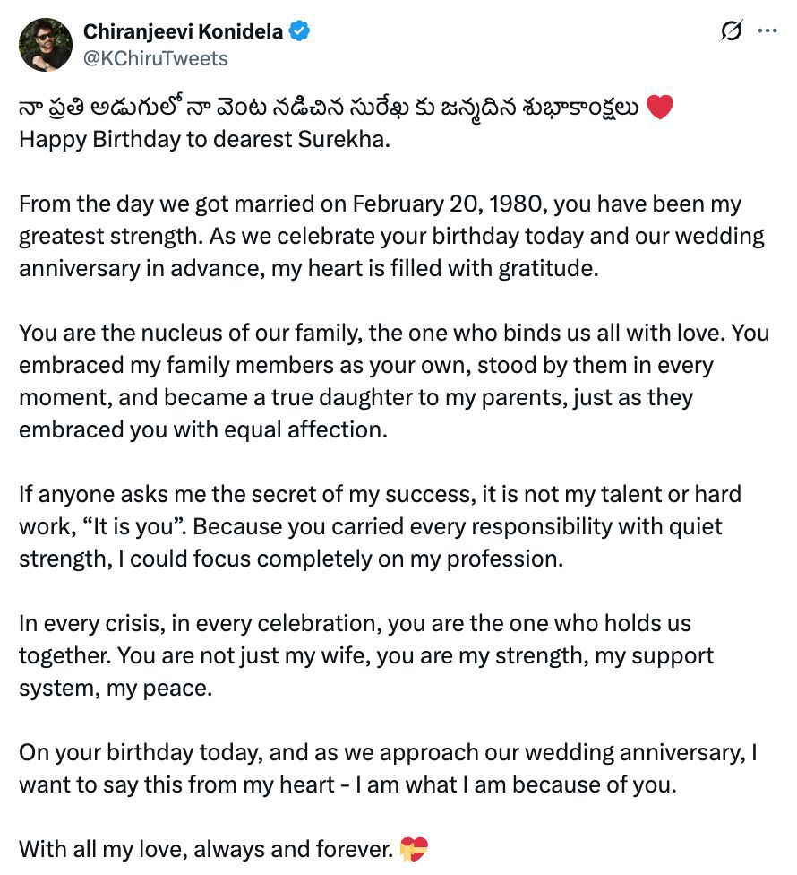 Megastar Chiranjeevi has once again reminded fans that beyond his towering stardom, he is a man who deeply values relationships and gratitude. His heartfelt birthday message to his wife Surekha