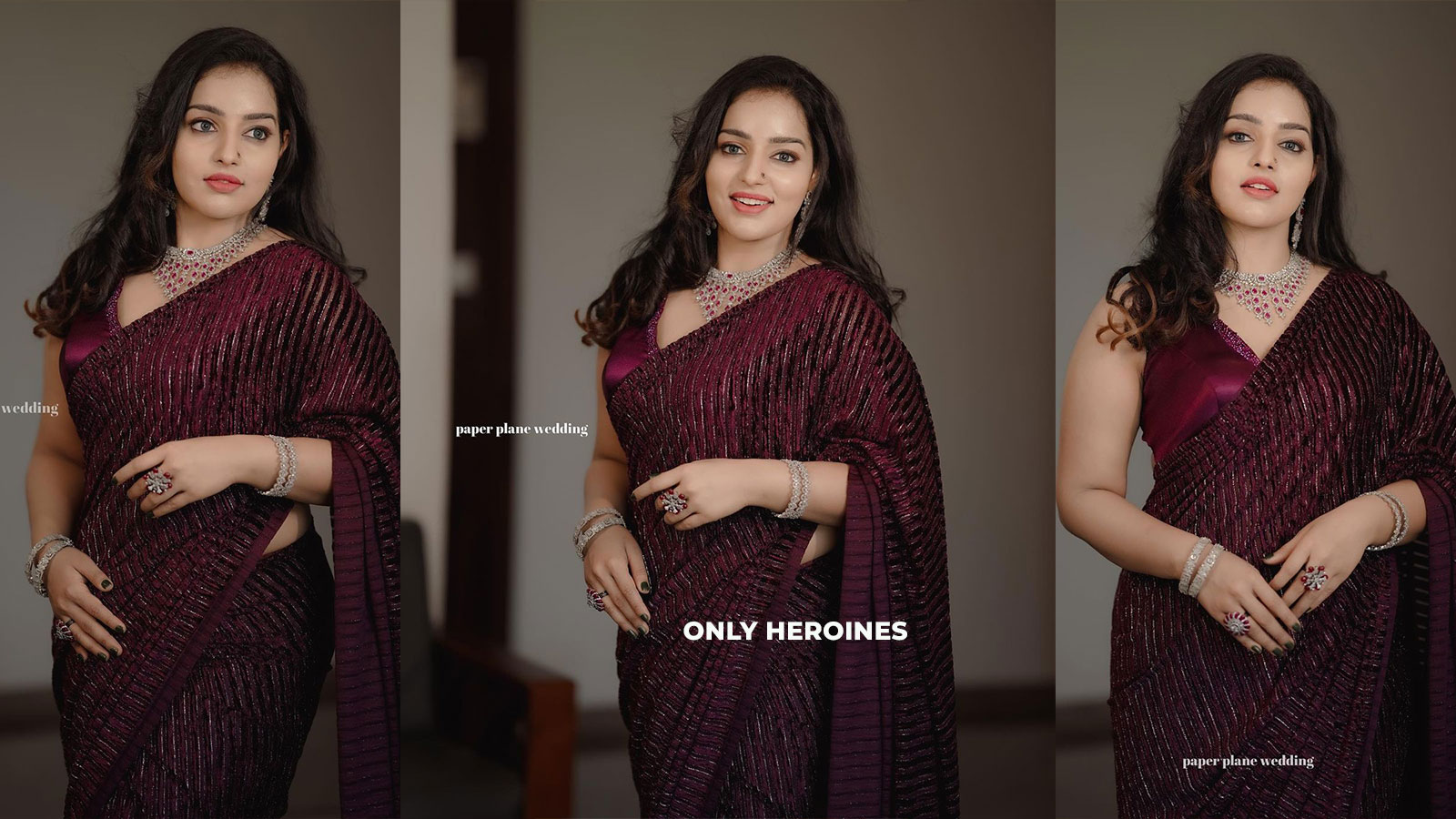 Malavika Menon, an exclusive Malayalam actress, is seen wearing a violet saree.,