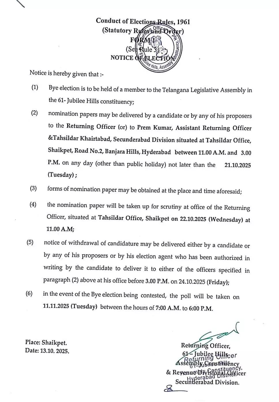 Jubilee Hills bypoll: ECI issues notification; high-stakes contest kicks offJubilee Hills bypoll: ECI issues notification; high-stakes contest kicks off