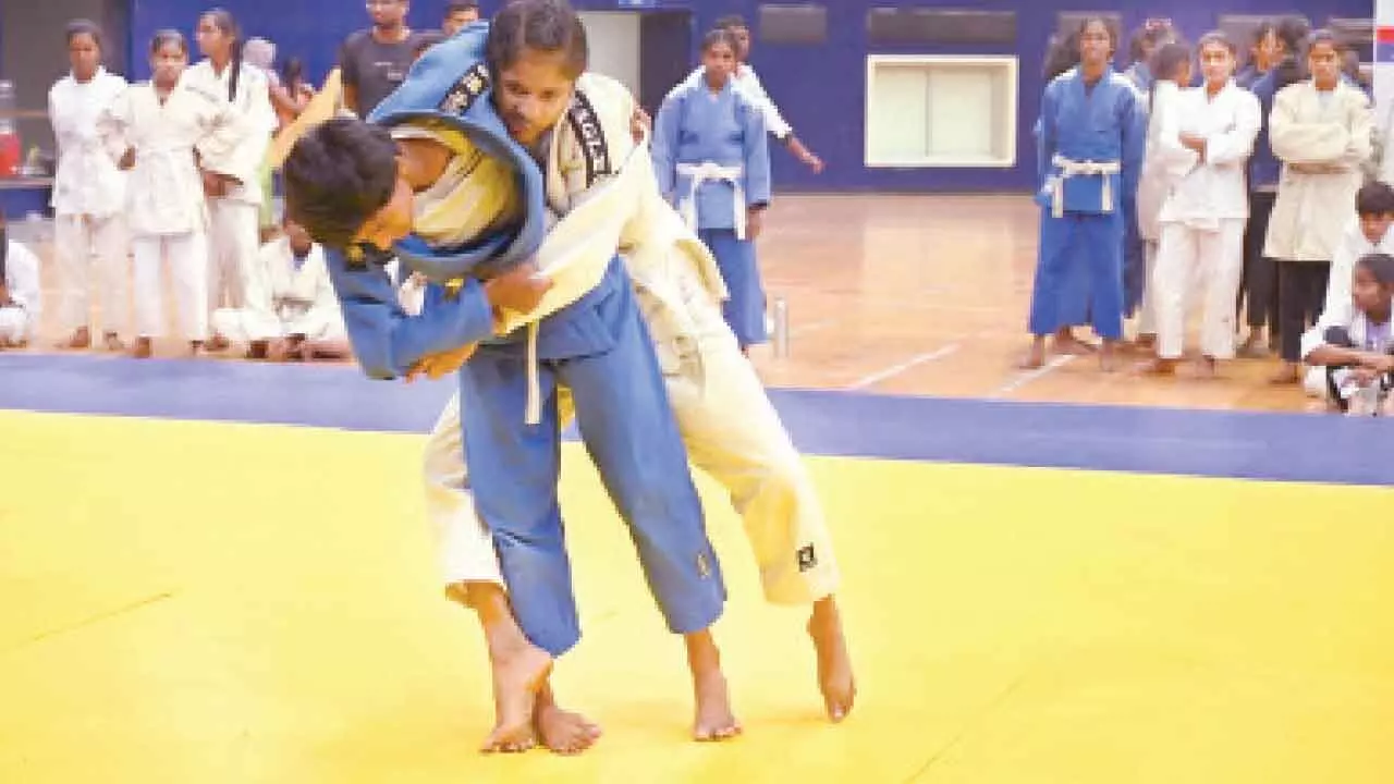 Two young girls grapple during a judo bout as the Chief Minister’s Cup 2025 concludes on a historic note in Telangana, recording 5,00,276 registrations and advancing 21,500 athletes to the state level across 44 disciplines