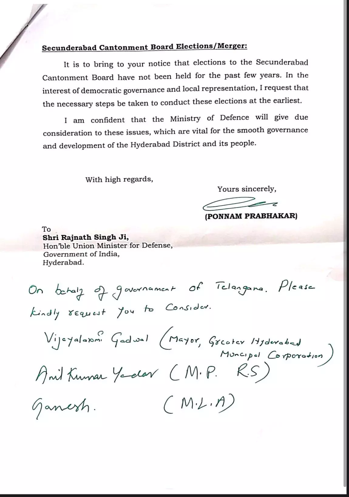 The letter, also signed by GHMC Mayor Gadwala Vijaya Lakshmi, Rajya Sabha MP Anil Kumar Yadav, and Secunderabad Cantonment MLA Ganesh, expressed appreciation to the Centre for agreeing in principle to release certain defence lands for public use.