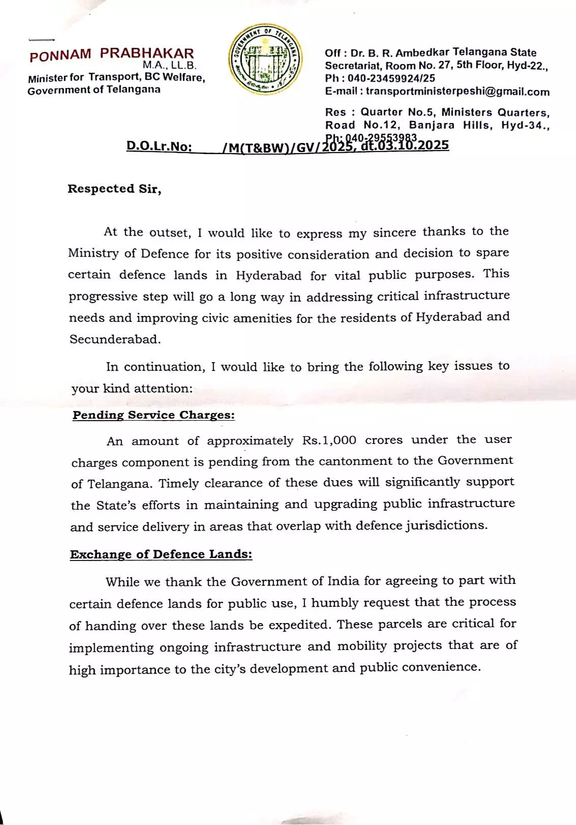 Ponnam Prabhakar also reminded the Defence Ministry that nearly Rs 1,000 crore in user charges from the Cantonment to the Telangana government remain pending, urging timely settlement to strengthen civic services in defence areas.