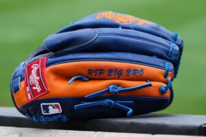At first glance, Mets’ left-handed pitcher Sean Manaea’s glove is a simple one – a basket web in his team colors of blue and orange. It isn’t something that necessarily