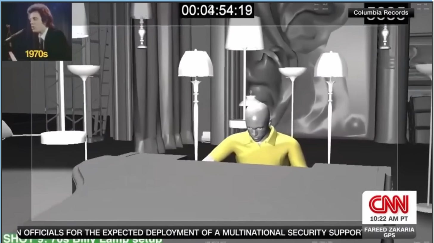 For the first three “Billy’s,” actors portray his character with attention to performance detail; mimicking his piano performance mannerisms as closely as possible. The song’s writer/producer portrays 70’s Billy, with others playing the 80’s and 90’s versions. And of course Billy himself portrays present-day Billy Joel. These actors’ portray Billy’s mannerisms of that era and age. Their actions trigger deep learning A.I. to output essentially a “deep fake” version of the scene, matching the actors’ movements and facial expressions with the assigned version of Billy Joel.
